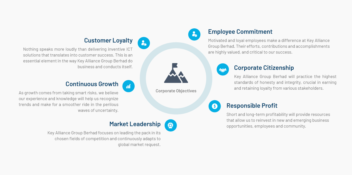 Key Alliance Group Berhad, formerly known as DVM Technology Berhad, has evolved since its establishment in 1997, transitioning from a pure IT company to a diversified multi-sector group while upholding consistent principles and values. This change in identity reflects the company's long-term vision of fostering synergistic relationships among its subsidiaries. Diversification has enabled the group to access varied industries, facilitating the creation of innovative products with enhanced synergy and efficiency. By leveraging its expertise, the group aims to provide competitive advantages to its valued customers in Malaysia and beyond.